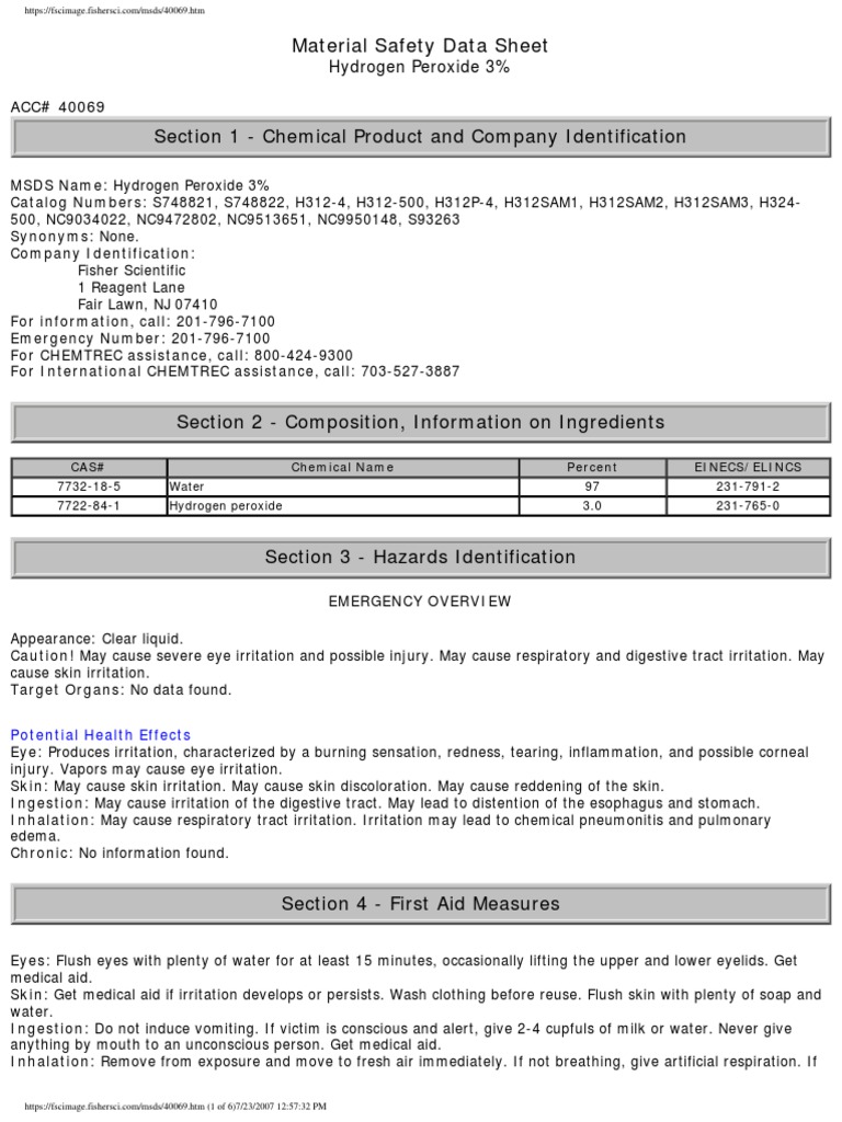1907/2006 (reach) hydrogen peroxide solution. Safety data sheet hydrogen peroxide 3% first priority, inc. Safety data sheet (hydrogen peroxide 3% ) page 5 of 10 additional measures: Safety data sheet sds hydrogen peroxide 3% usp revision date: If breathing is difficult, remove victim to fresh air. Page 1 of 7 prepared to u.s. Ghs label elements, including precautionary statements. Description of first aid measures.