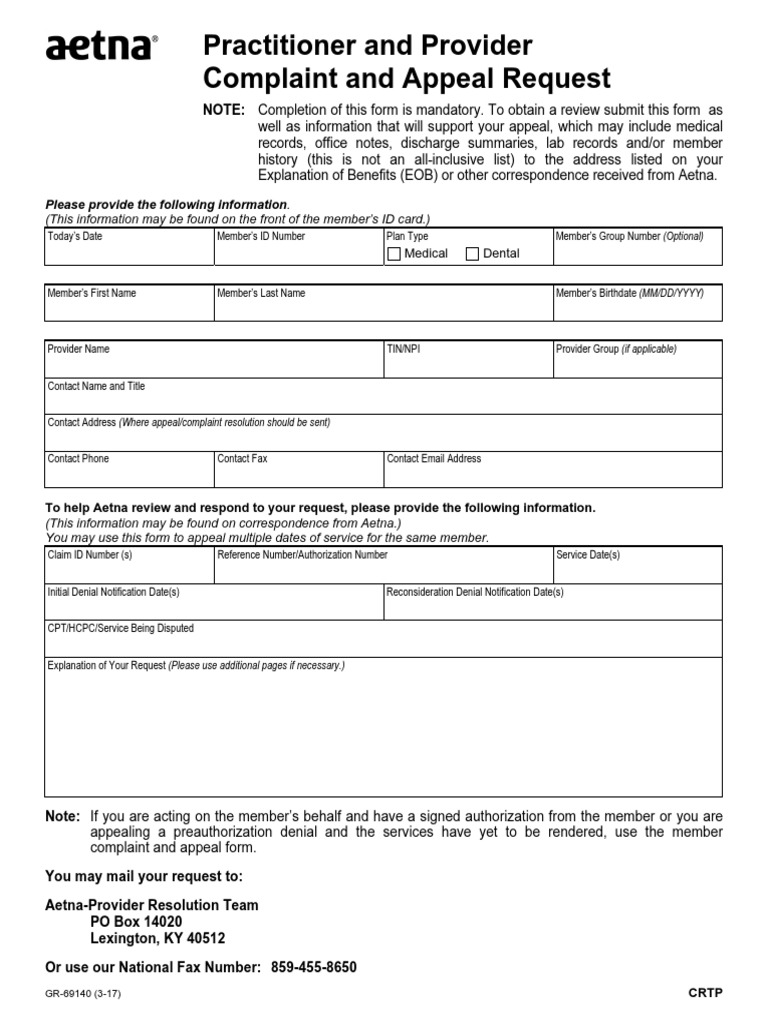 This form is for your representative's use in making suggestions or filing formal complaints. If you are acting on the member’s behalf and have a signed authorization from the member. Completion of this form is voluntary. Member complaint and appeal form. Download and complete this form to request a review of a claim or service denial by aetna.