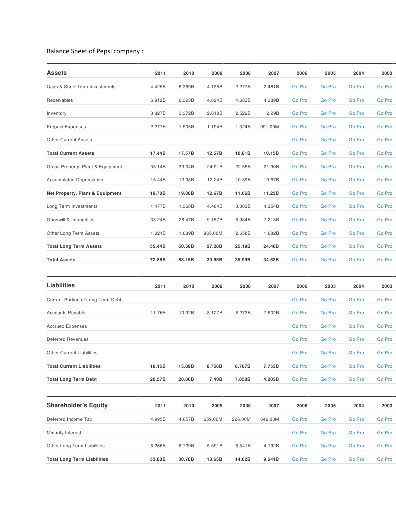 Find the latest balance sheets published by pepsico, inc. Up to 10 years of financial statements. View all pep assets, cash, debt, liabilities, shareholder equity and investments. Get the detailed balance sheet for pepsico, inc. View as % yoy growth or as.