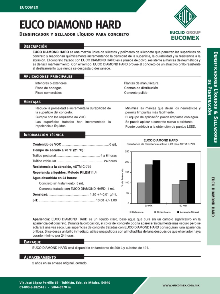 Euco diamond hard liquid hardener, densifier and sealer. Euco diamond hard is packaged in 55 gal (208 liter) drums, 5 gal (18.9 liter) pails and 6/1 gal (3.8 liter) units per case. Euco pcw technical data sheet pdf. Euco diamond hard is a unique blend of silicate and siliconate polymers that penetrate concrete surfaces and chemically react to provide an..