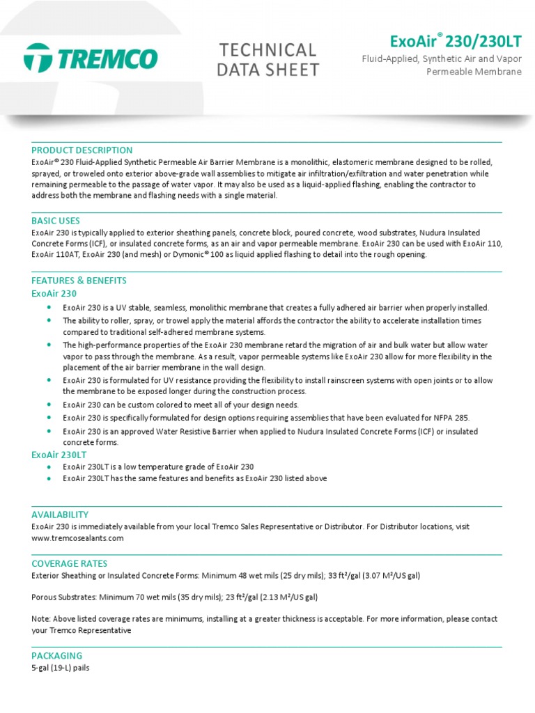 Exoair 230 / 230lt resources. Exoair 230 is specifically formulated for design options requiring assemblies that have been evaluated for nfpa 285. Download any of these featured resources or find a specific type of document below. All tremco safety data sheets (sds) are in alignment with the globally harmonized system of.
