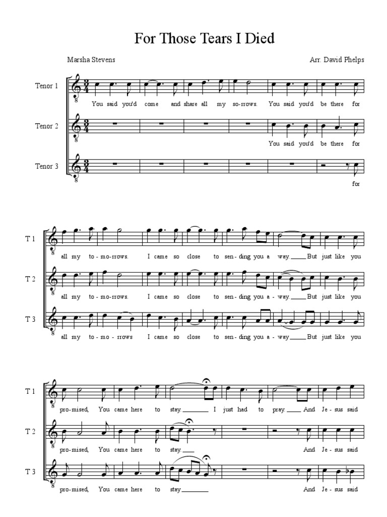 Your home for premium sheet music. Share, download and print free sheet music of for those tears i died marsha j stevens for piano, guitar, flute and more with the world's largest. Print and download sheet music by for those tears i died, sheet music arranged for piano/keyboard, voice (transposable). Those am/g tears g i c died.” 2 chorus: For those tears i died sheet music from the artist bill gaither arranged for piano. See for those tears i died sheet music arrangements available from sheet music direct;