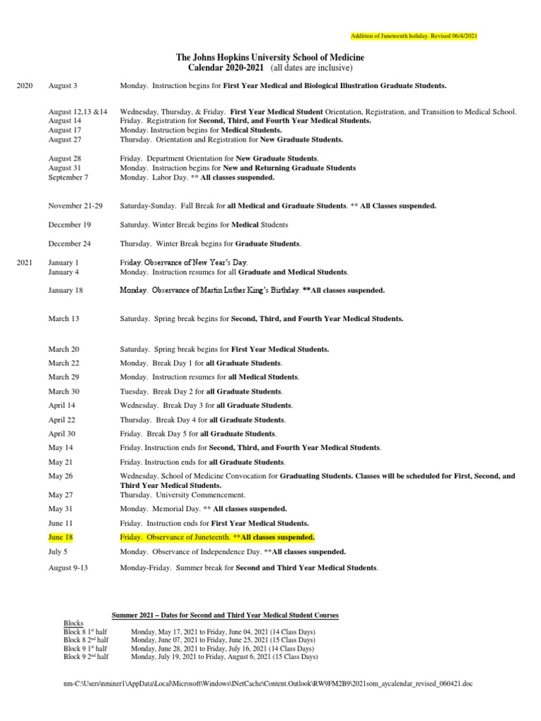 The Johns Hopkins University School of Medicine Calendar 20202021 (All