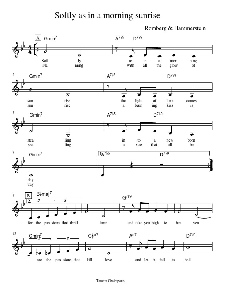 Softly, as in a morning sunrise. Softly as in a morning sunrise c: 0 download jpg click to listen %%partsfont kreon box t: Music by sigmund romberg lyrics by oscar hammerstein ii published in 1928.