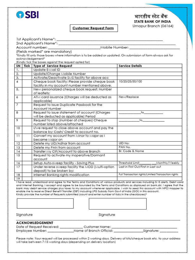 Fillable Online PDF SBI Customer Request Form Free (state bank of india
