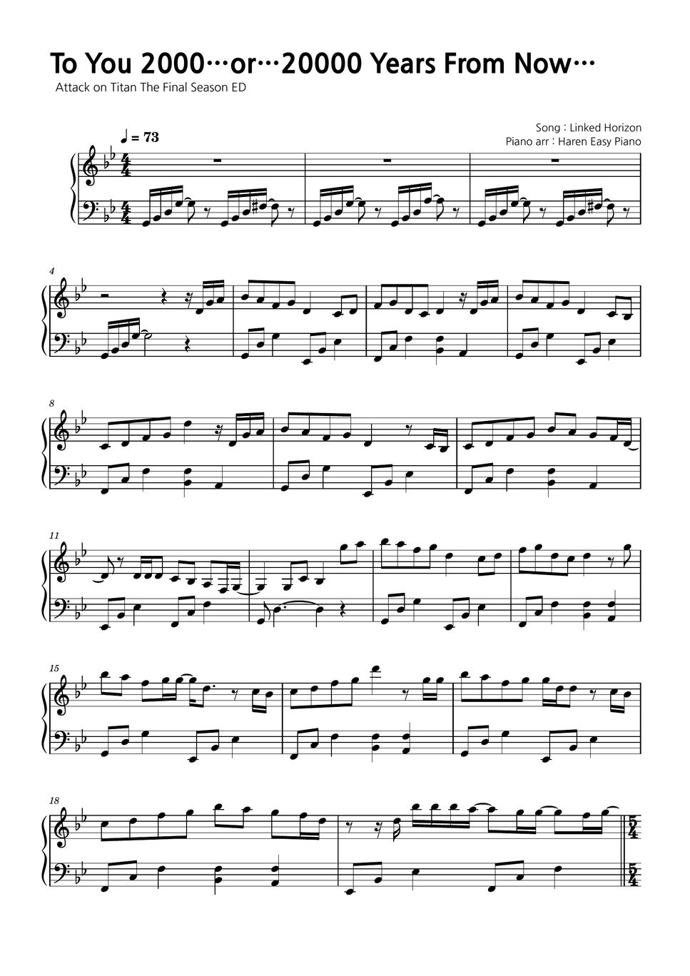 Print test to you, 2000 years. Sheet music by music lah arranged for piano. Piano solo in g minor. Original music by linked horizon piano arrangement by animenz