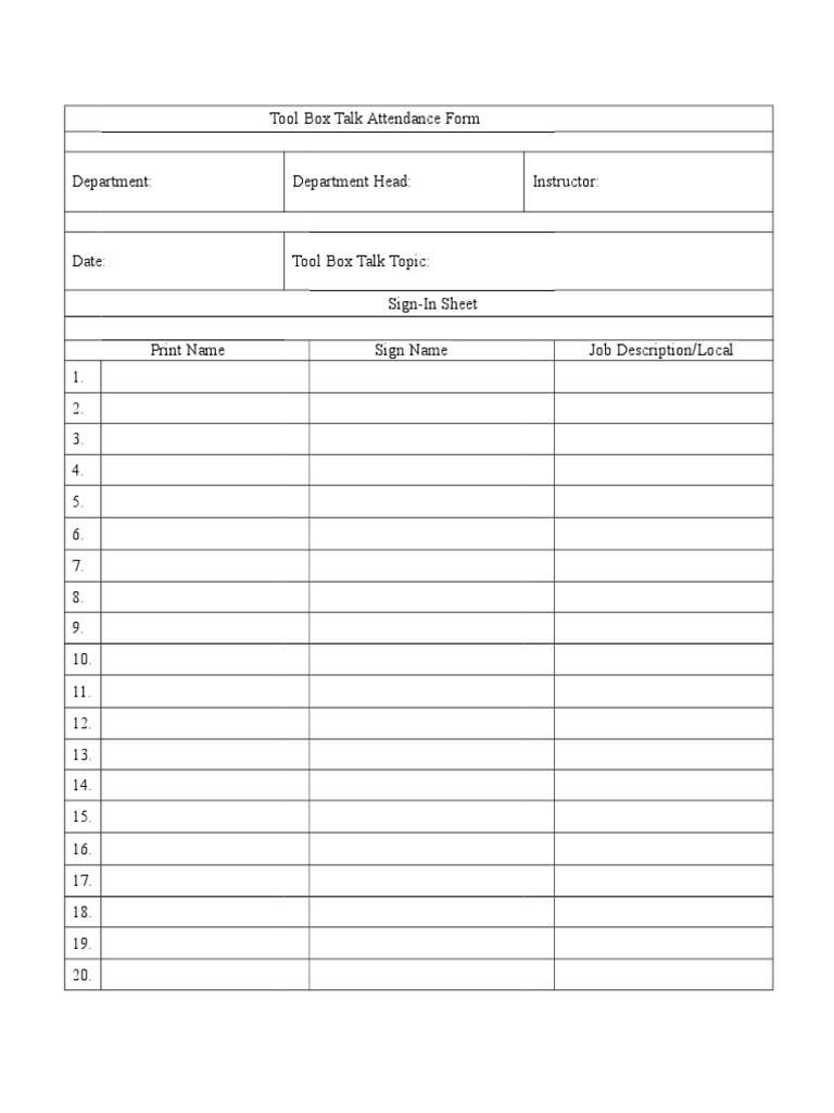 Tool Box Talks Sign In Sheet - It allows instructors to keep track. This tool box talk attendance form is essential for documenting attendance during safety discussions.